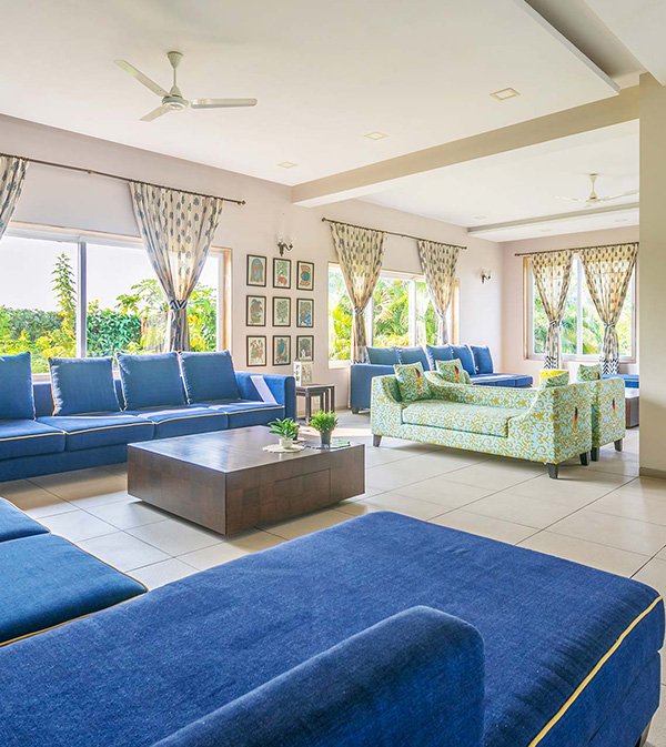 The ground-floor living room accommodates up to 40 guests and features ACs, a portable music system, and Wi-Fi.