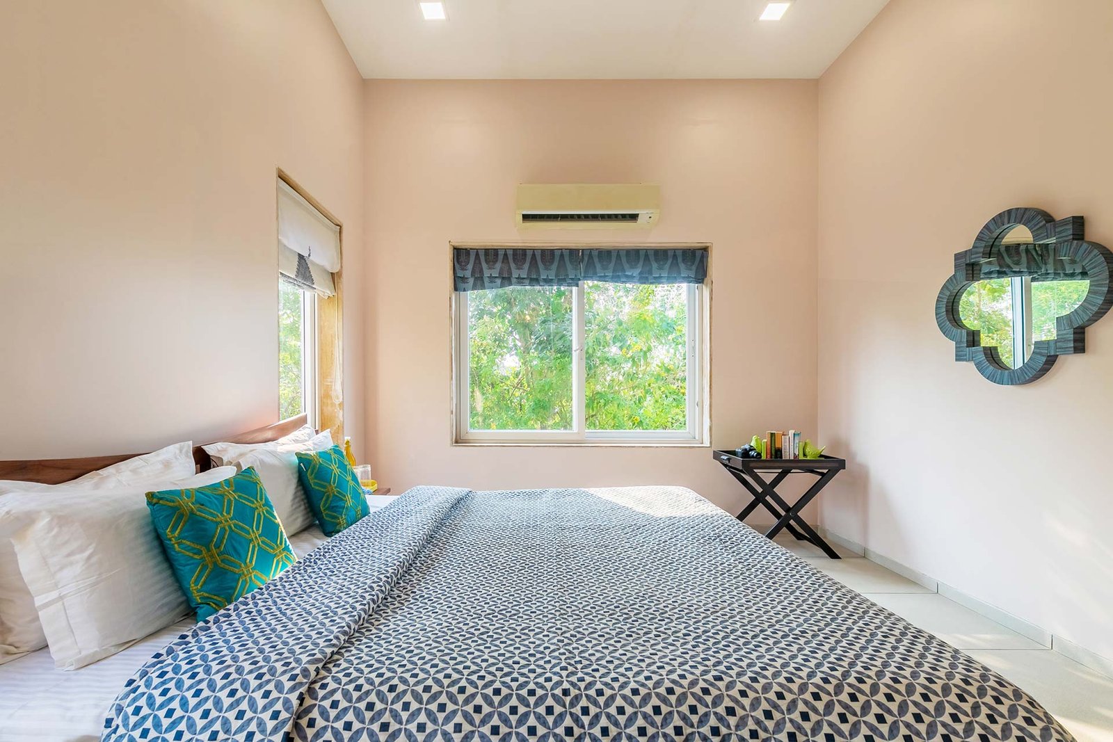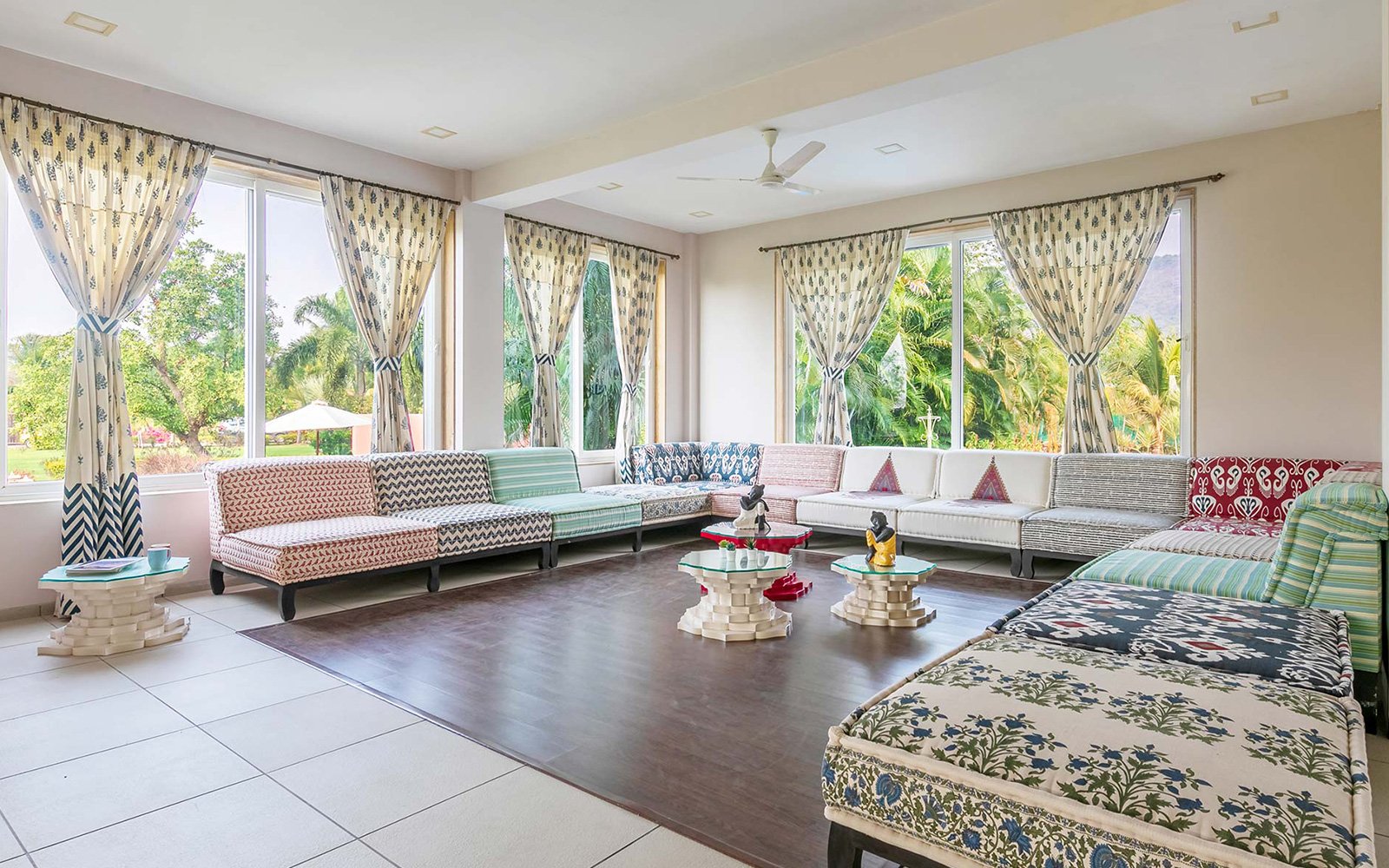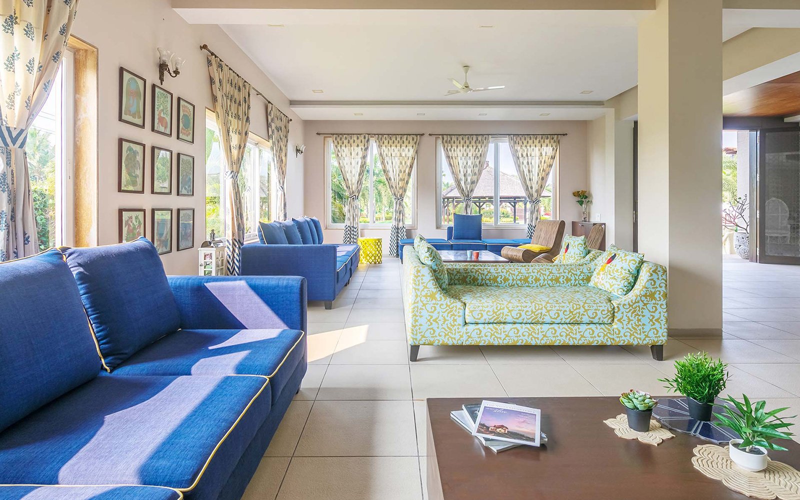 The ground-floor living room accommodates up to 40 guests and features ACs, a portable music system, and Wi-Fi.
