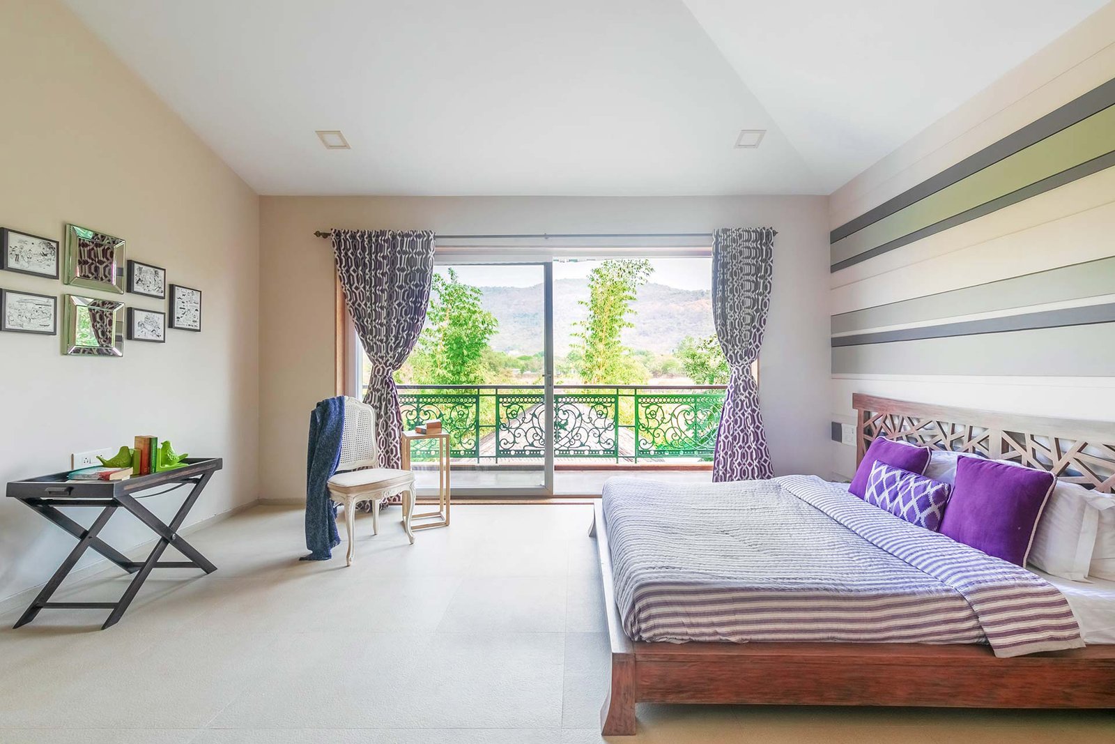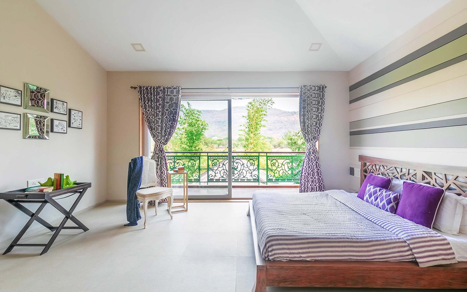 This room, located on the first floor, contains a king-sized bed and a private balcony overlooking the verdant lawn and gazebo of the villa.