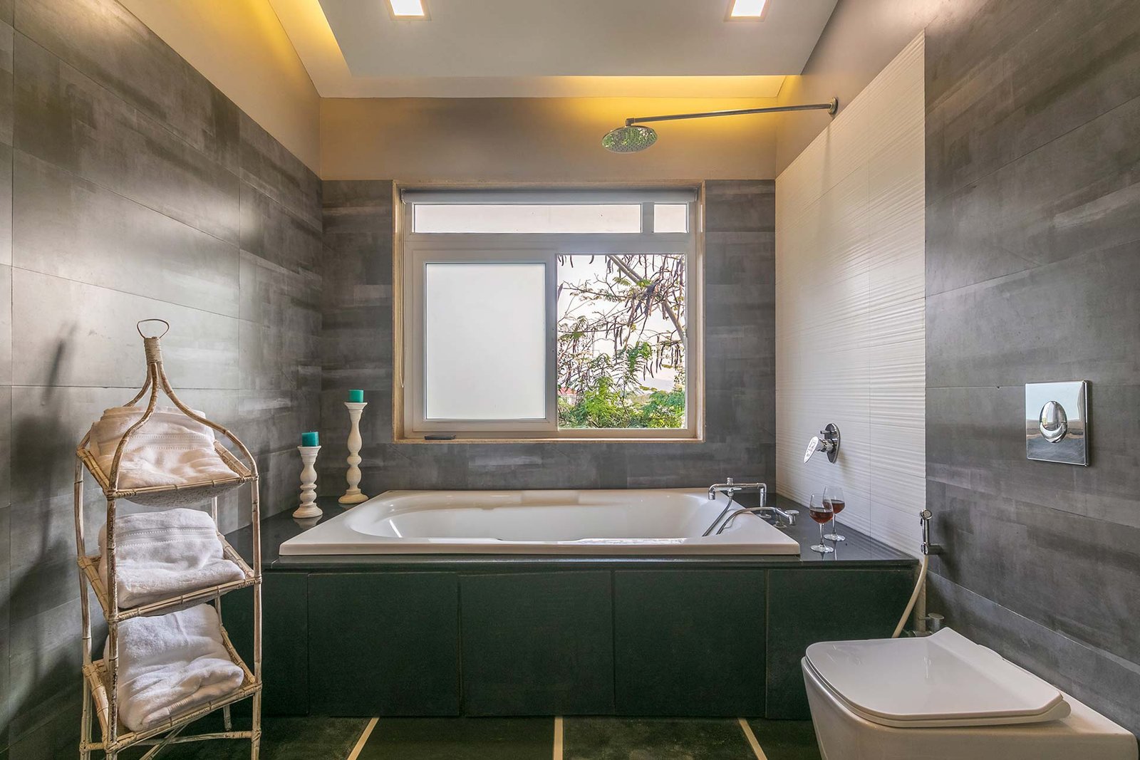 Indulge in relaxation within the ensuite bathroom, which includes a luxurious bathtub, geyser, towels, and essential toiletries.